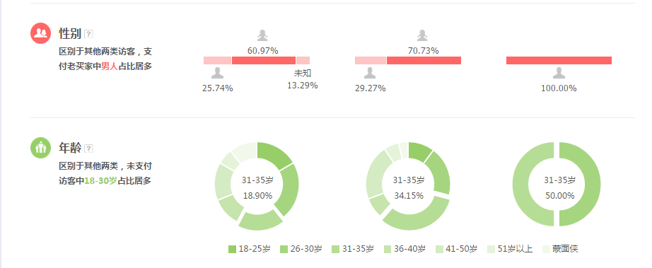 上图可以看出,31-35岁的消费人群占据34%,26-35岁消费人群占据60%,所以我们选择的宝贝款式应该是符合这类的女性的爱好的,这类女性的经济条件可以说是很宽松的,针对品质的要求会比较高,那么我们的目光定位应该在产品的内在,比如服装就会需要面料舒适,款式低调不花哨。