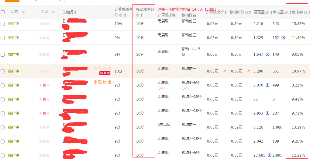 第二步:在确定款式有潜力,图片点击没问题的情况下,重新筛选关键词,需要展现量非常大,且点击率好的词10个左右(展现量大是为了后续人群测试,点击率好是为了能保证出高价就会有点击),选好词之后,所有的词无线端都出价卡到4-6位,PC端可以不管,愿意花钱的掌柜可以卡到前三,这样点击率更好,同时计划的日 限额提到500元一天。这个阶段只要点击率和加购,不看产出。