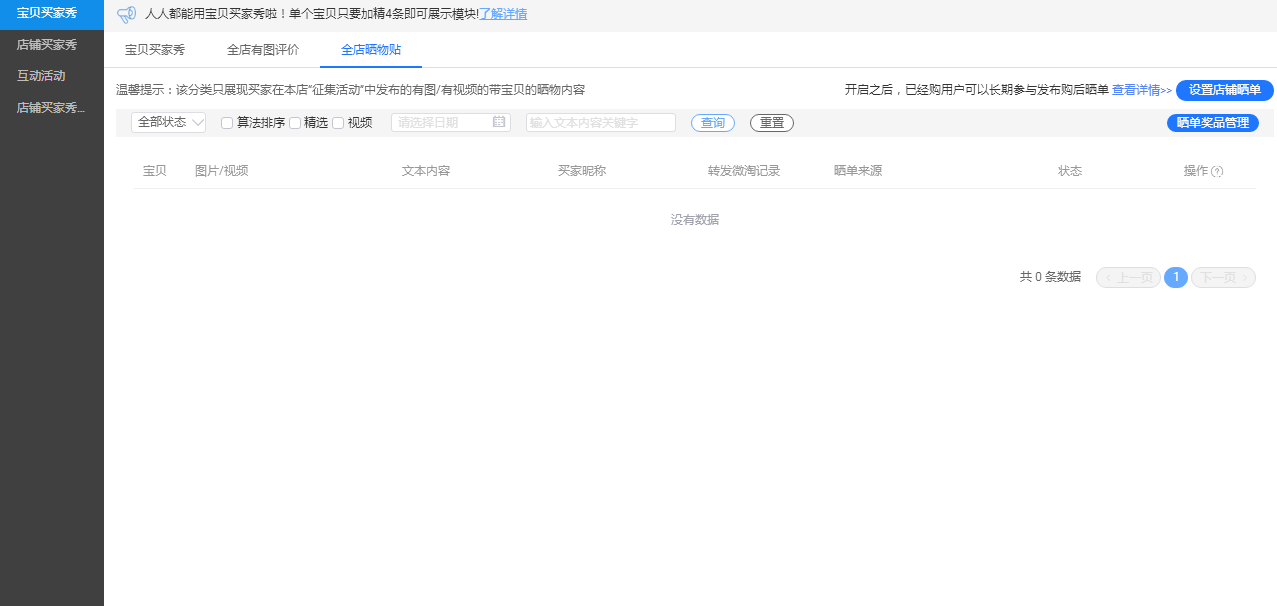 首先还是进入买家秀后台,然后点击全店晒物站,这里就是店铺晒单的运营区域了。